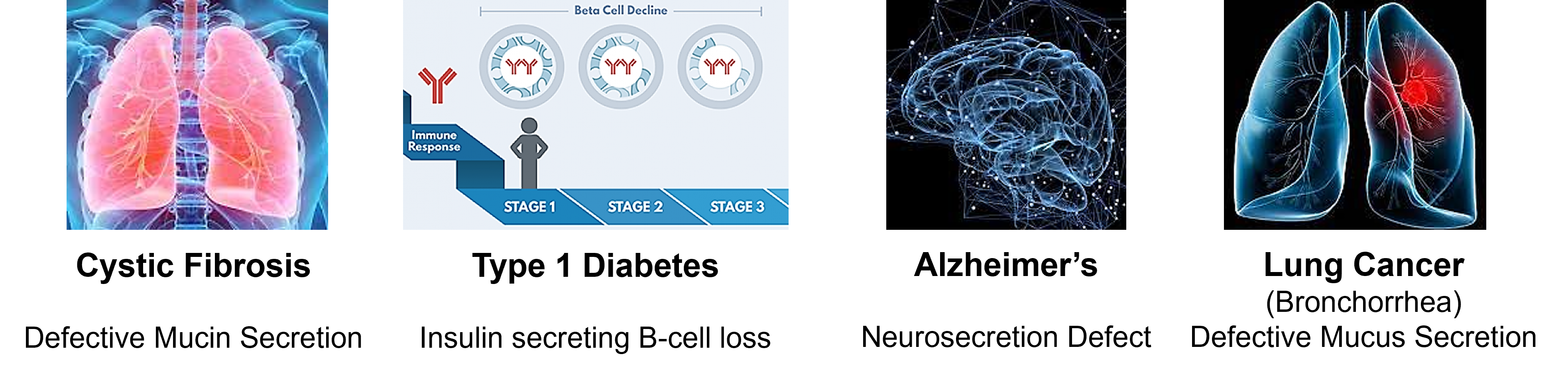 These porosomes, composed of over 30 proteins, play a pivotal role. Research underscores that alterations in specific porosome proteins lead to secretory disorders and diseases like Cystic Fibrosis, Cancer, Diabetes, and neurological conditions. We are actively advancing development of drugs targeting these diseases.