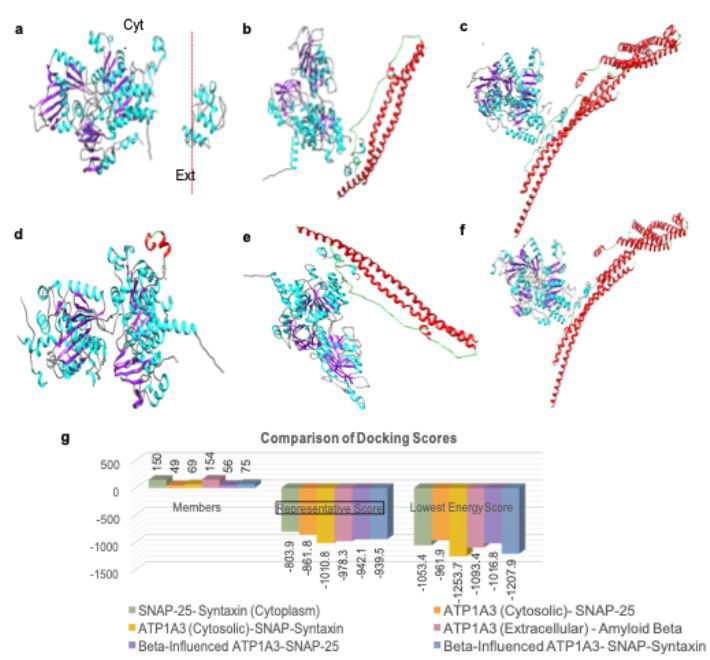 AI reveals binding interactions between porosome proteins SNAP-25, Syntaxin-1, and ATP1A. Amyloid beta binding to the extracellular domain of ATP1A3 negatively impacts the binding interactions between ATP1A3-SNAP-25-Syntaxin-1A in the cytosolic domain within the neuronal porosome complex.
