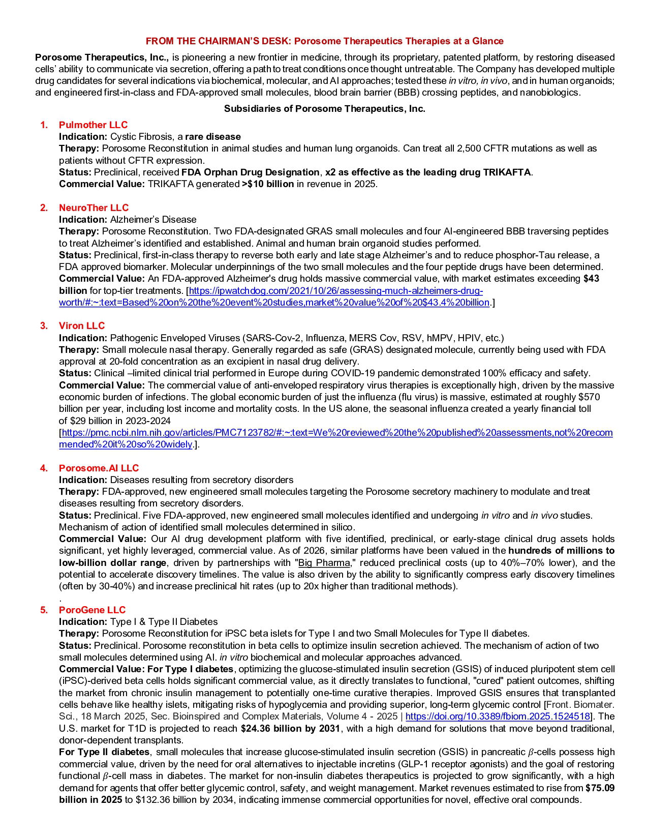 From the Chairman's Desk (Feb. 23, 2026) Porosome Therapeutics Therapies